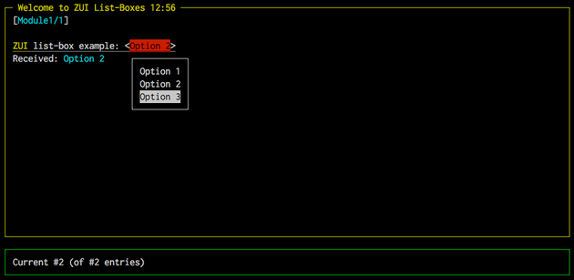 Creates list-box. Every list box has a text width that it will occupy in the document regardless of the option's text length. This width is specified via name of variable holding the width number. Current-selected option is <index param> – also a variable name. Options are specified by ;-separated string, put in a variable whose name is passed as the fourth argument (<options param>). The handler will be called on the accept event (i.e. Enter-press; Cancel is ESC-press, it restores previous list-box current option).